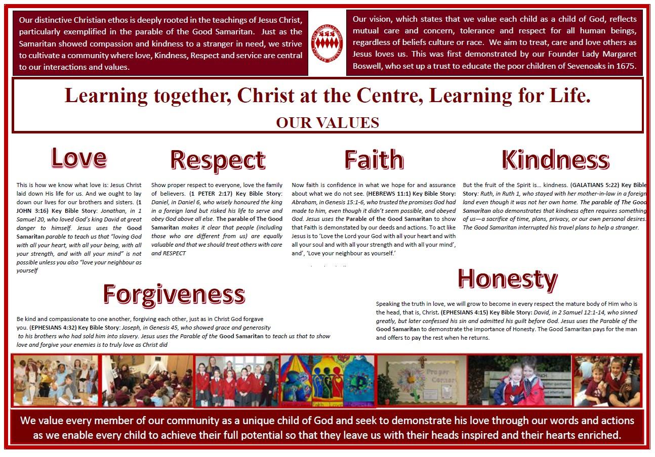 Our school values are all reflected in the parable of the Good Samaritan, as well as being rooted in other passages throughout the Bible.