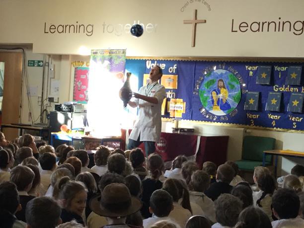 This morning the whole school were treated to a science show from Fizz Pop Science. The show was all about forces and the findings of the famous Sir Isaac Newton! The children saw rockets fly, toilet paper twirled and ping pong balls and a beach ball kept in the air! I’m sure that they’ll be able to tell you lots about it! It was brilliant to see that, when asked if they like science, every single child had their hand straight up in the air!