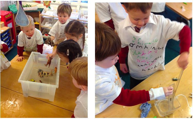 Today, the EYFS classes were investigating water displacement. We read the story "Mr Archimedes’ bath" and had to help him answer the question "Why does my bath always overflow?" The children observed the depth of the water when the tub was empty and then watched the level of water rise as they put animals in the tub. The children concluded that the water was rising because the animals’ bodies needed space in the bath and as a result pushed the water level up. Next, the children used rulers to measure and prove their theory. Wow, what excellent scientific work and skills Reception!