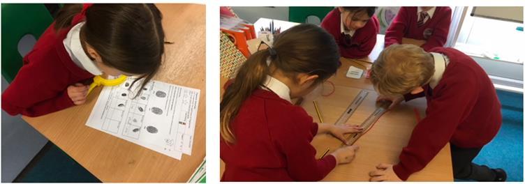 As well as this, Year 2 learned all about fingerprints. We learned that our fingerprints are determined in the womb and just get bigger as we grow. We learned that there are three main types of pattern; whorl, arch and loop, and our prints on each hand are not necessarily the same. We had to be detectives to find our own prints around the room! This meant using all our powers of observation. We learned that the police use magnetic powder and tape to ‘lift’ prints from crime scenes and that the first crime ever to be solved using fingerprint evidence was in 1892 in Argentina. We think we may have some budding Forensic Scientists in Year 2!