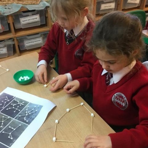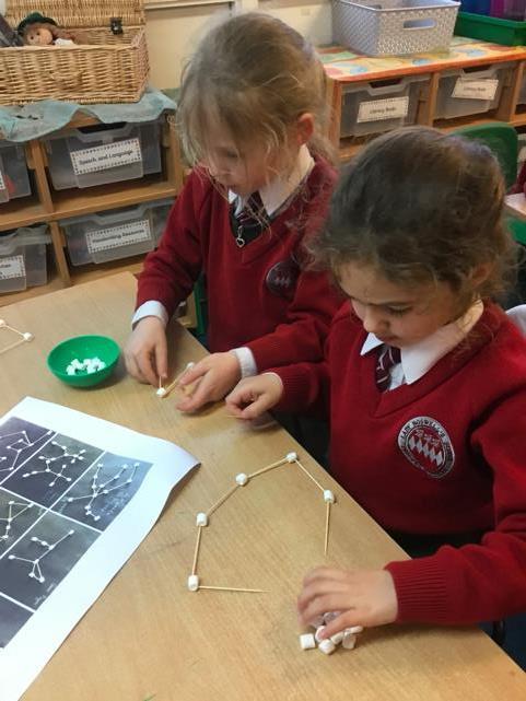 Today, Year 1 made mini marshmallow constellations! They researched and found out all about what a constellation is and then had the chance to make their very own using cocktail sticks and marshmallows! Later on, the children also explored shadows by making our own shadow puppets! Most of the children chose to make animals and tried to relate this to our science topic this term (animals, including humans). The pupils were able to discover and discuss how the shadows are made, as well as how the shape and size can change!