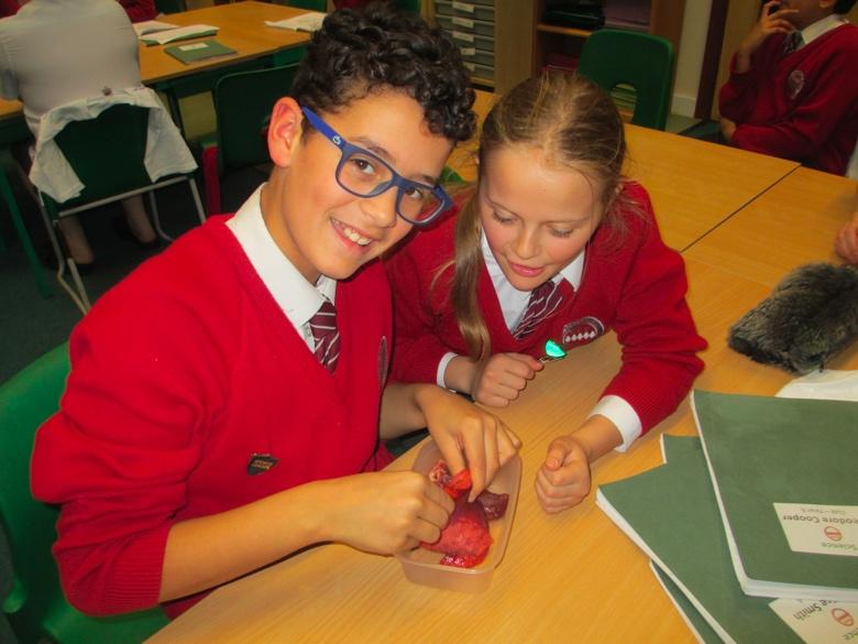 This afternoon, Year 6 examined a sheep's pluck, as part of their learning about the circulatory system. They compared the weight and texture of lungs to heart muscle and were able to see the main arteries and veins connecting the lungs and heart. The trachea and bronchial tubes were very clear when we dissected the pluck, and they could see the four heart chambers and the valves between them! This looked like very messy but fascinating work Year 6!